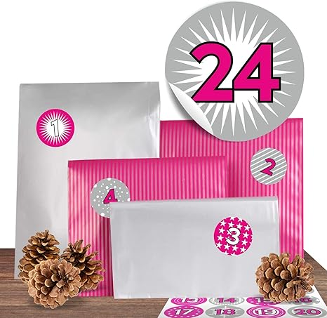 Adventino Adventskalender Fur Madchen Und Frauen Aus 24 Papiertuten Pink Und Silber Gemischt Zum Basteln Und Befullen Und Dazu Passenden Zahlenaufklebern Amazon De Kuche Haushalt